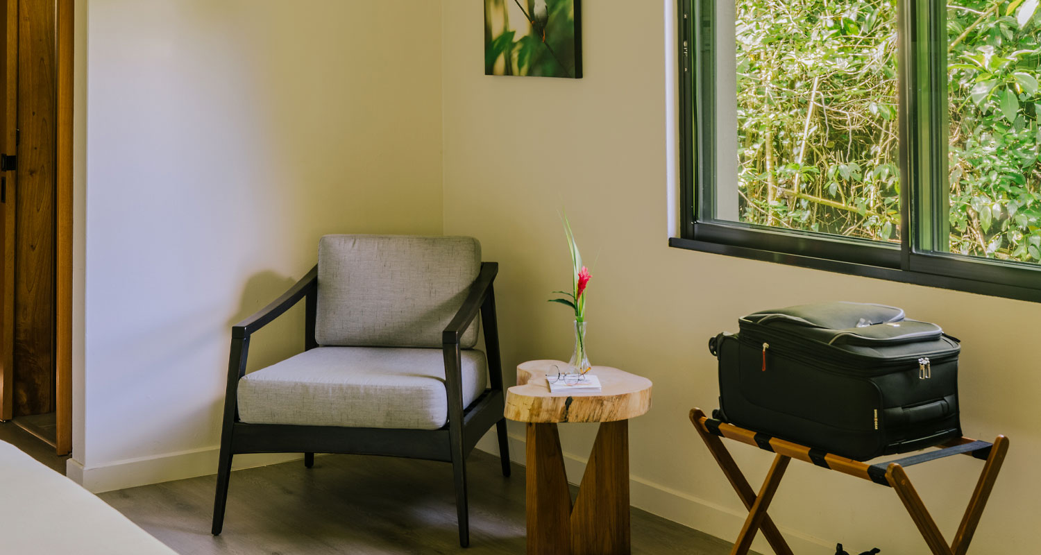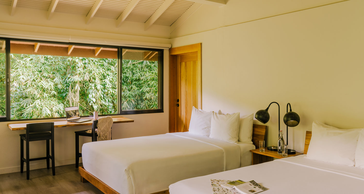 Large windows open to lush greenery and birdsong, creating a seamless flow between your room and the forest beyond. Whether you choose the elegance of a king bed or the flexibility of two queens, The Perch provides the perfect vantage point to unwind after a day of exploration.