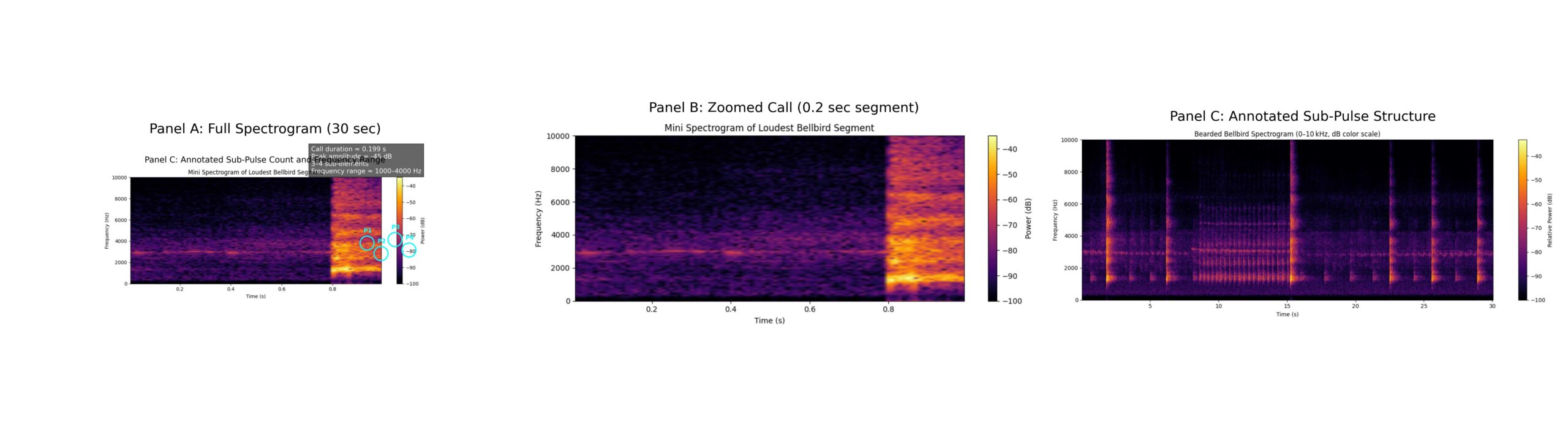 Below, explore the sonic world of the Bearded Bellbird. Each clip can be paired with visual spectrograms that reveal the rhythm, frequency, and amplitude of the call: